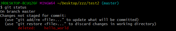 git status 명령어를 통해 파일이 지워진 것을 확인한다. deleted: hello_world 라고 출력되는 것을 알 수 있다.