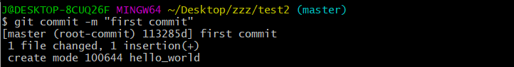 git commit -m "first commit" 명령어를 통해 staging 영역에 있는 hello_world 파일을 이제 Local repository로 옮겨준다.