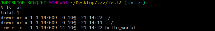 이제 로컬저장소에 commit이 완료되었으므로 hello_world라는 파일은 깃에서 관리된다. 즉 워킹디렉터리에서