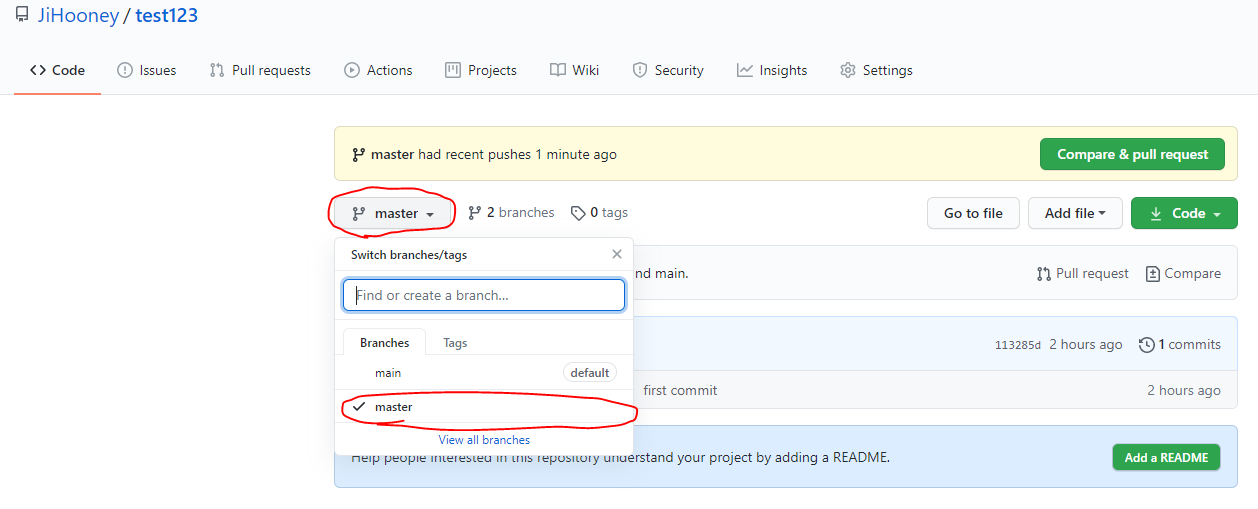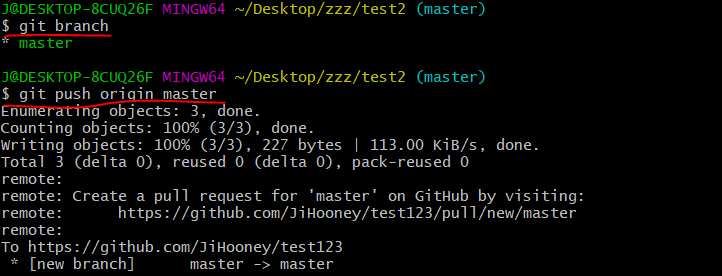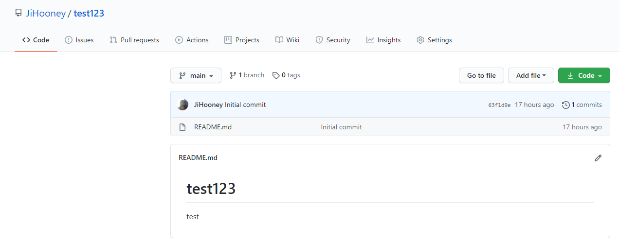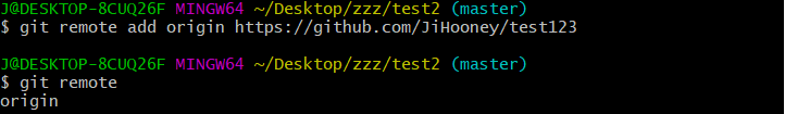 git remote add origin https://github.com/JiHooney/test123 명령어를 입력한다.