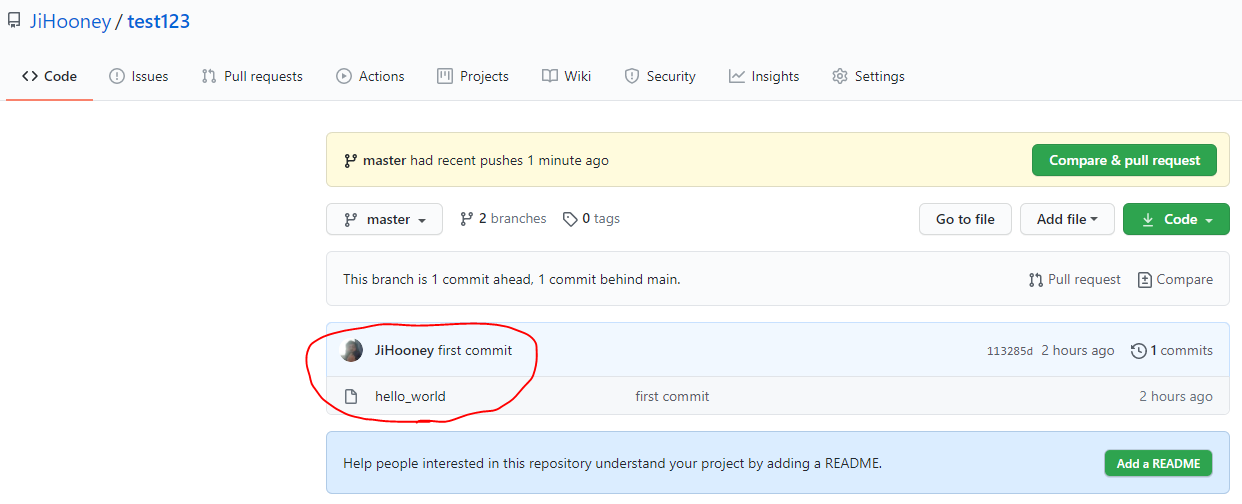 master 브랜치에 들어오면 로컬저장소에 있던 hello_world 파일이 제대로 push됐음을 확인할 수 있다.