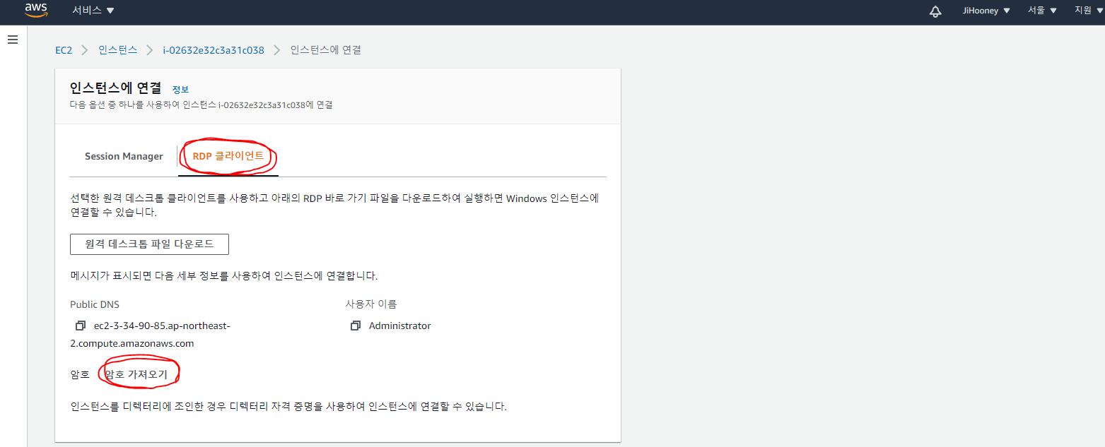1. 생성된 windows 서버에 접속하기 위해 [인스턴스] 페이지에서 [연결] 클릭하거나 인스턴스 선택후 마우스 오른쪽 버튼 클릭 후 [연결]을 클릭한다.