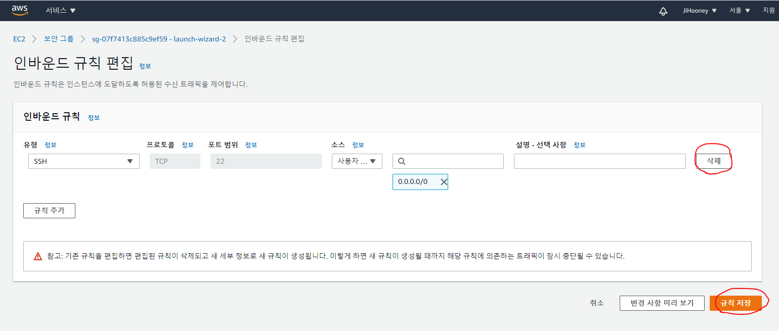 1. 보안그룹의 [인바운드 규칙 편집] 페이지에서 [규칙 추가] 버튼을 클릭하고 [유형]에서 'SSH'를 선택하고