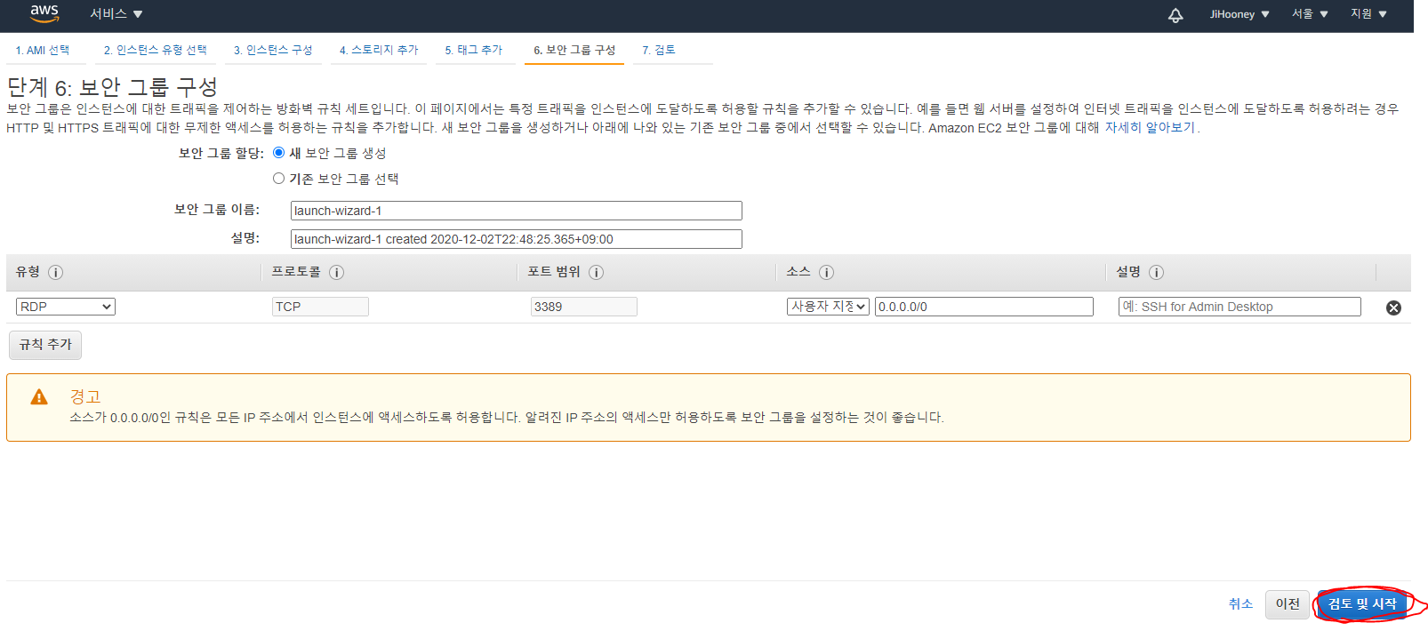 10. 보안 그룹 설정 정보 확인 후 [검토 및 시작] 버튼 클릭