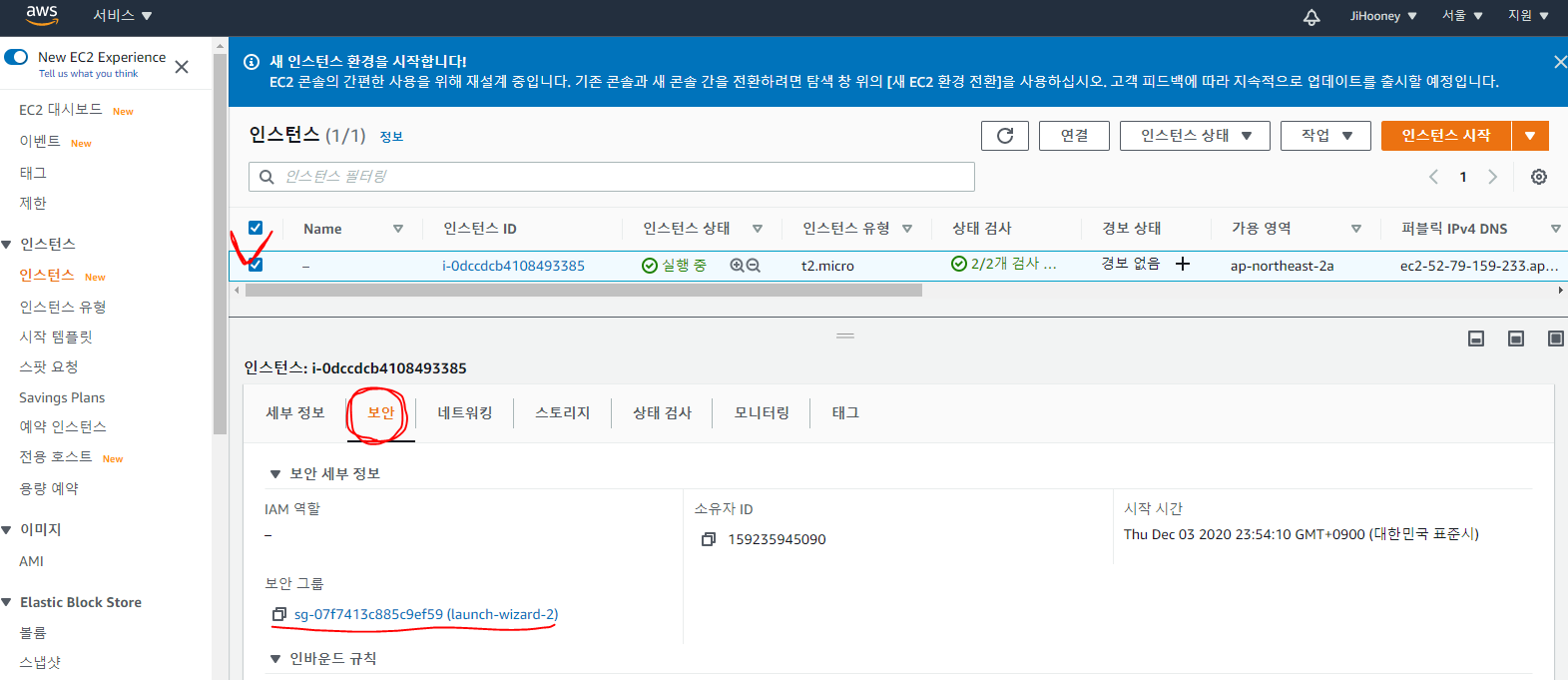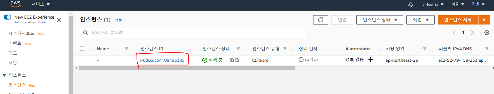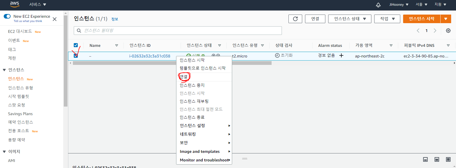 9. 접속할 Linux 인스턴스 정보를 확인하기 위해 AWS console에 접속하여 인스턴스를 선택후