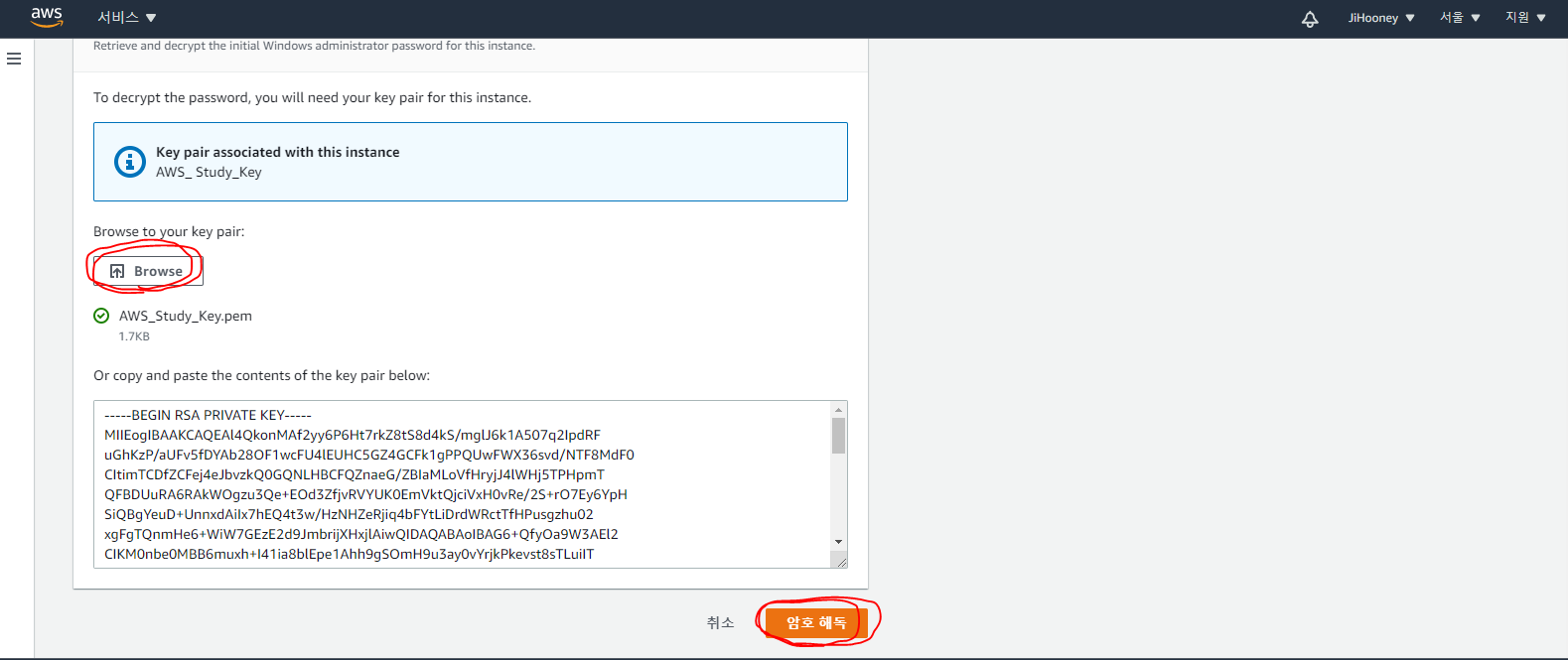 5. Linux 인스턴스 생성시 선택한 기존에 생성한 키 페어 파일(AWS_Study_Key.pem)을 선택 후