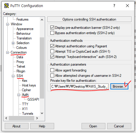 8. 여기서 [connection] -> [SSH] -> [auth] 메뉴의 [private key file for authentication]항목에서 바로 전에 생성한