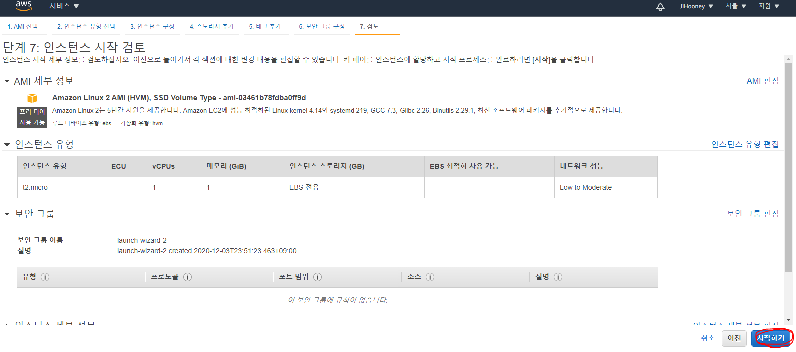 4. [인스턴스 시작 검토] 페이지에서 기본적인 정보를 확인후 [시작] 버튼을 클릭한다.