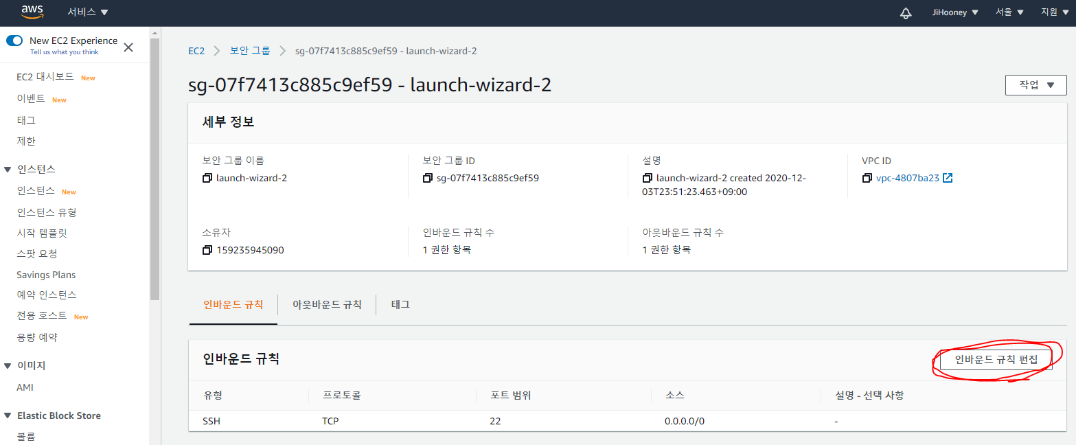 2. [보안그룹]의 "인바운드 규칙" 탭에서 [인바운드 규칙 편집] 버튼을 클릭한다.
