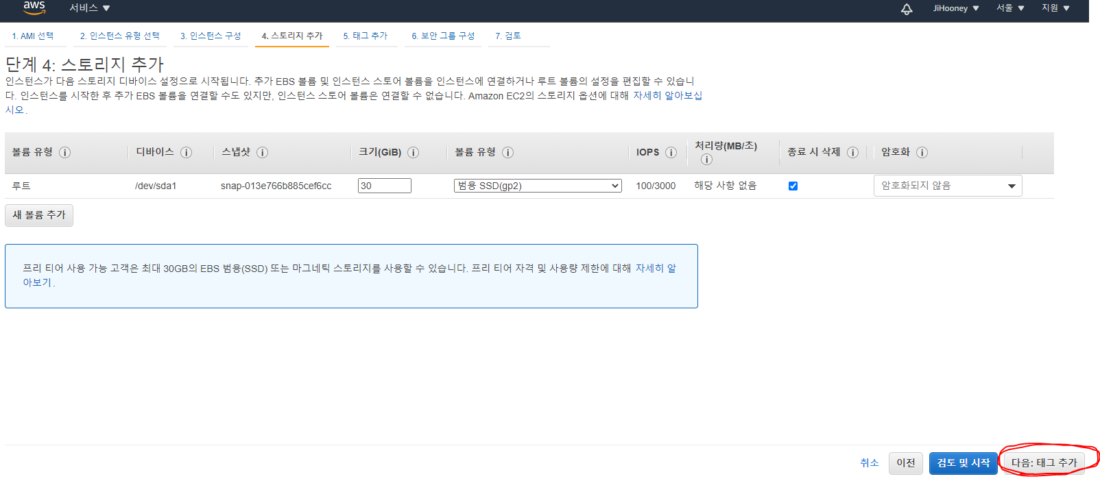 8. 스토리지 정보 확인후 [다음: 태그 추가] 클릭