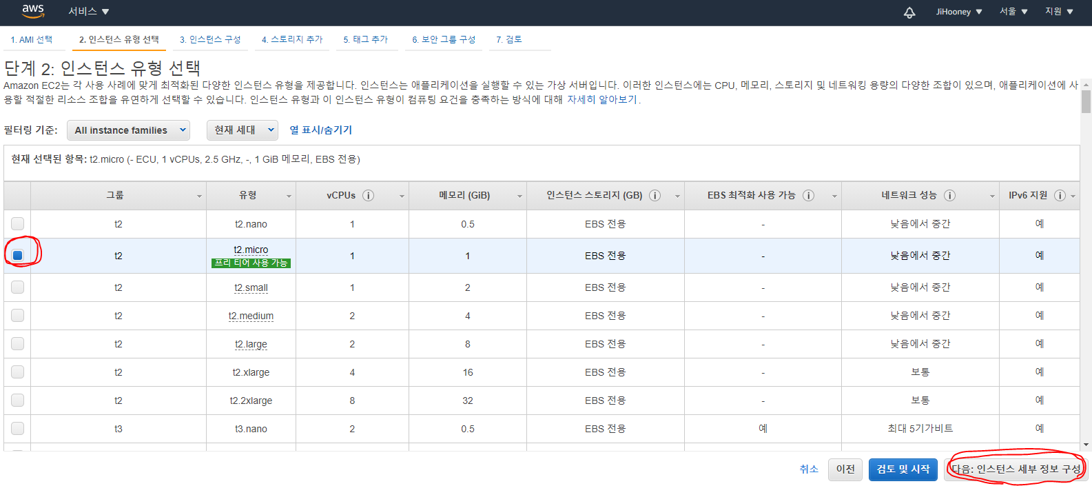 6. "t2.micro" 선택 후 [다음: 인스턴스 세부 정보 구성] 클릭