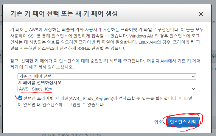 5. [기존 키 페어 선택] 누른 뒤 "AWS_Study_Key.pem"을 클릭한다.