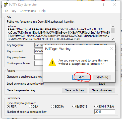 6. PuTTY로 import할 private key의 생성을 위해 [save private key]를 클릭 후