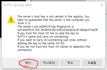 4. 이제 PuTTY로 Linux 인스턴스에 접속을 시도하면 보안그룹을 삭제하였기 때문에 다음과 같이 접속 오류가 발생한다.