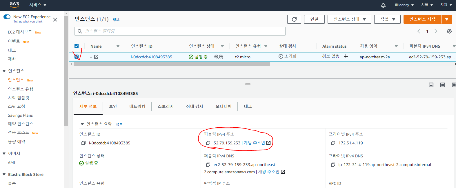 IPv4 퍼블릭 IP정보를 확인한다.