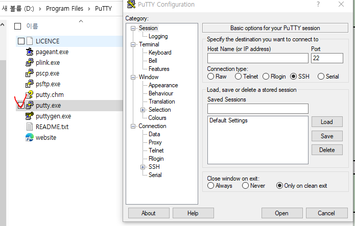 그리고 창을 닫은 다음 다시 PuTTY설치 폴더로 가서 "putty.exe"파일을 실행한다.