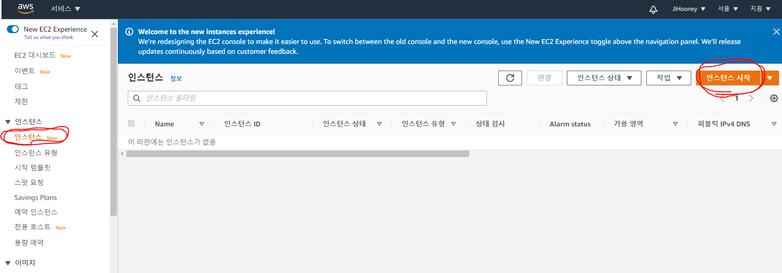 4. [인스턴스] 클릭하여 [인스턴스 시작] 누르기