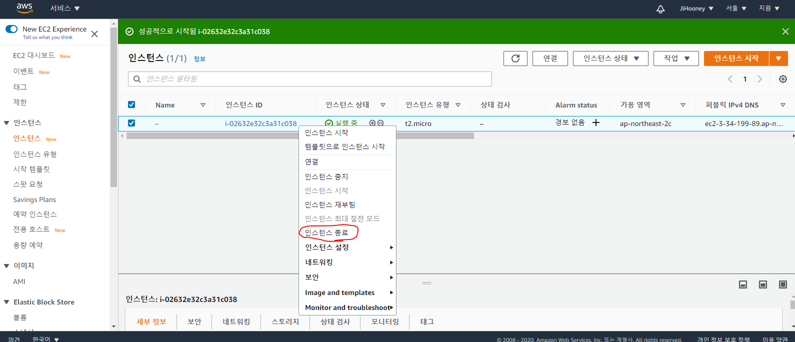 [인스턴스 종료]를 누른다.