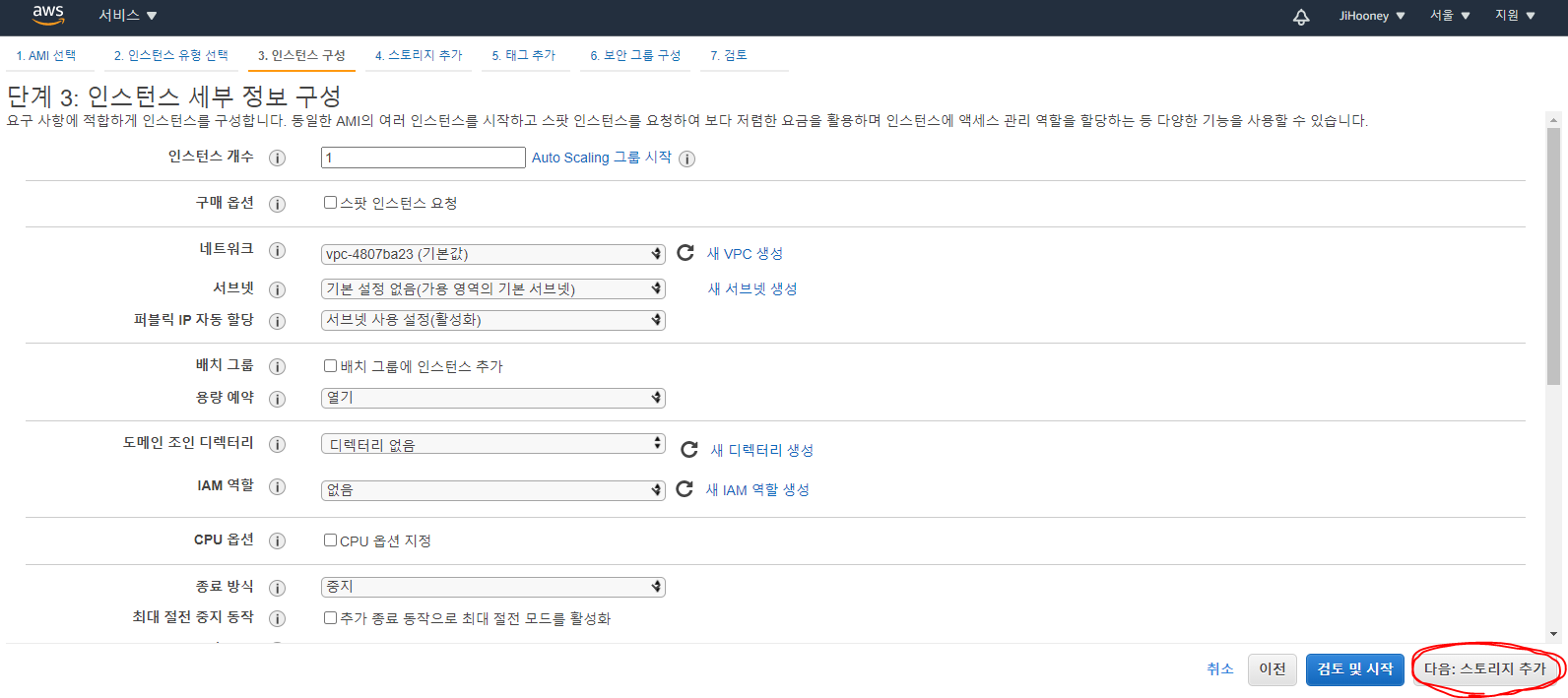 7. 기본값 그대로 놔두고 [다음: 스토리지 추가] 클릭